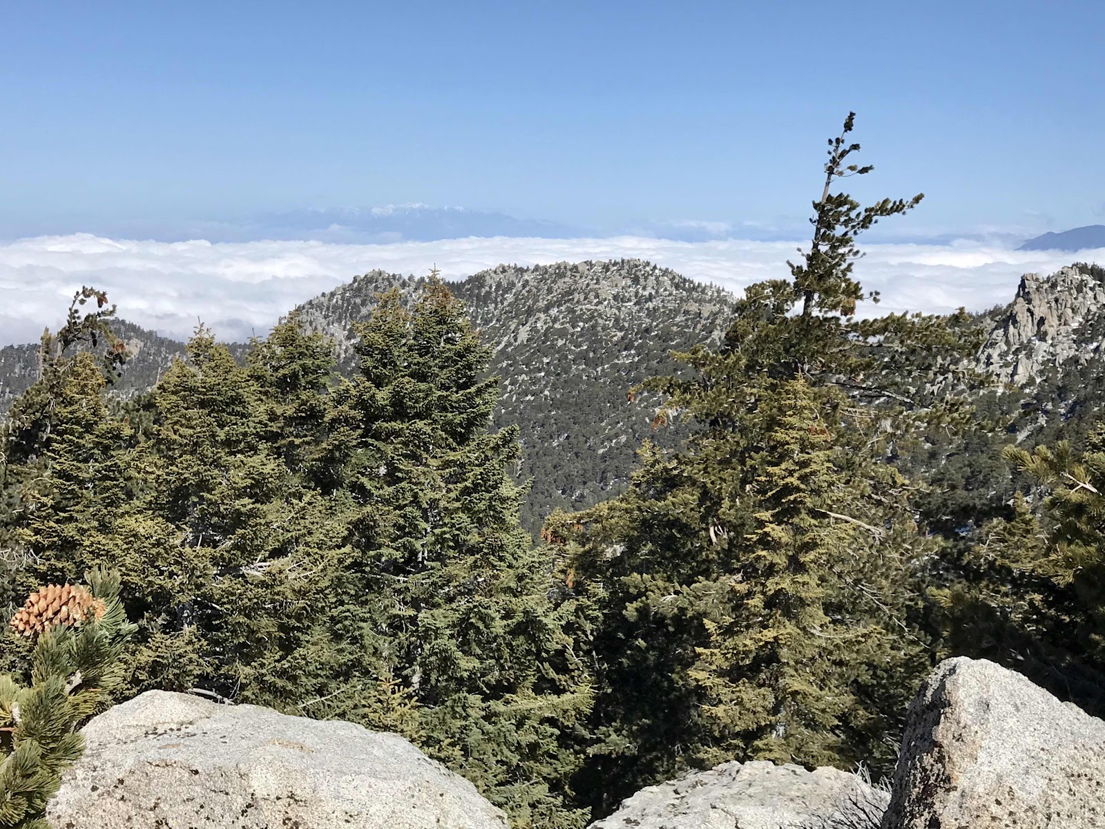 Sugar pines, the steep slope and the San Bernardino mountains in the distance.